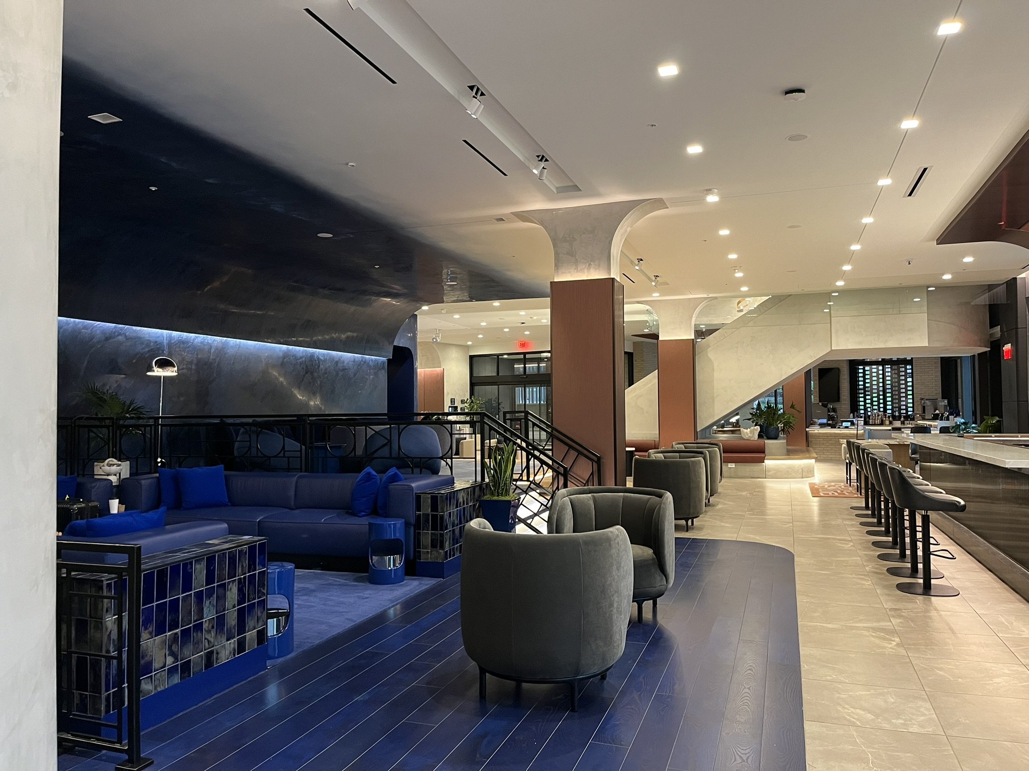 The second tower, Aloft Hotel, is 82,000 square feet across seven stories, perched atop the parking structure.