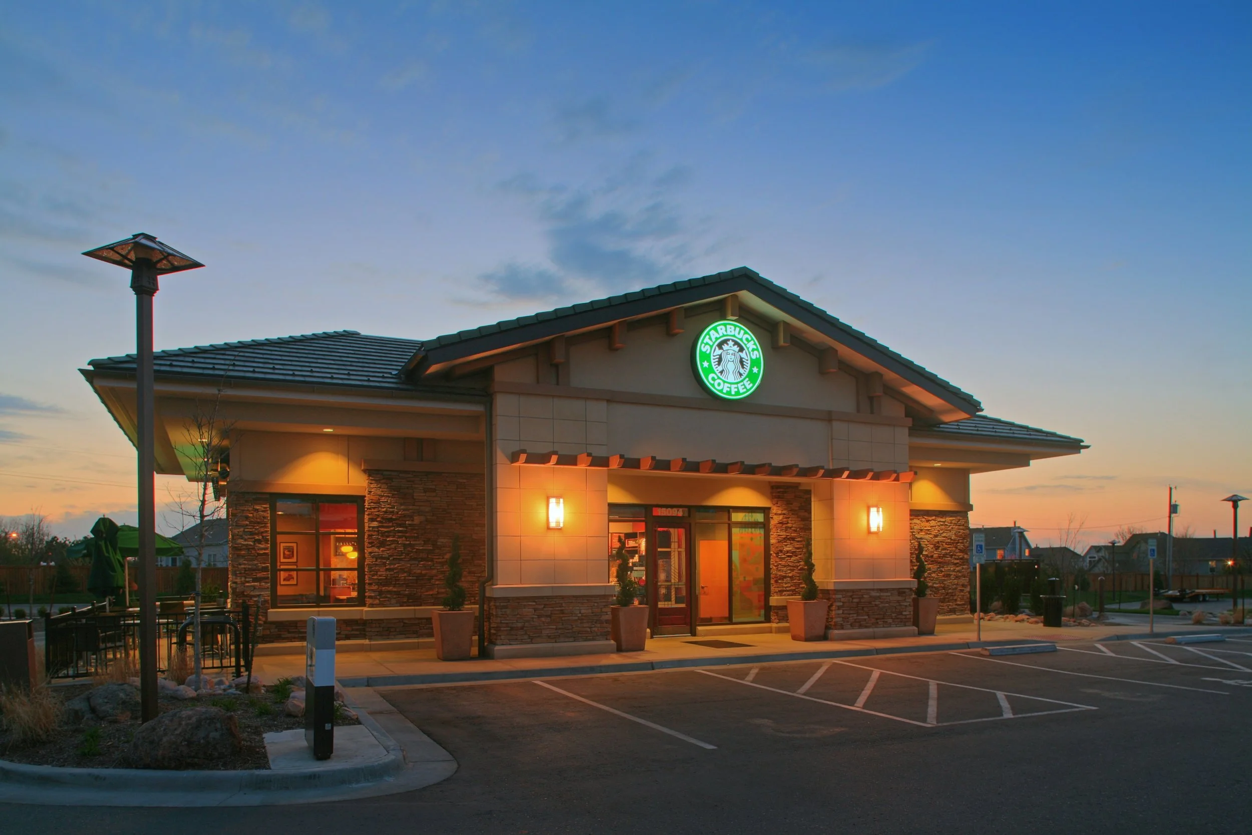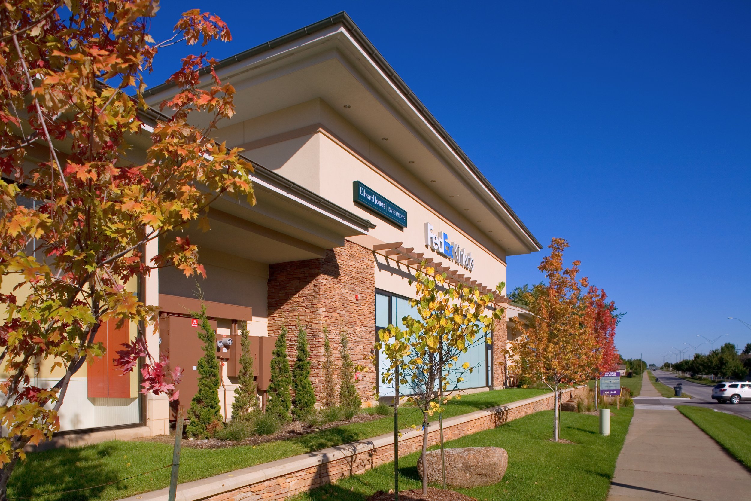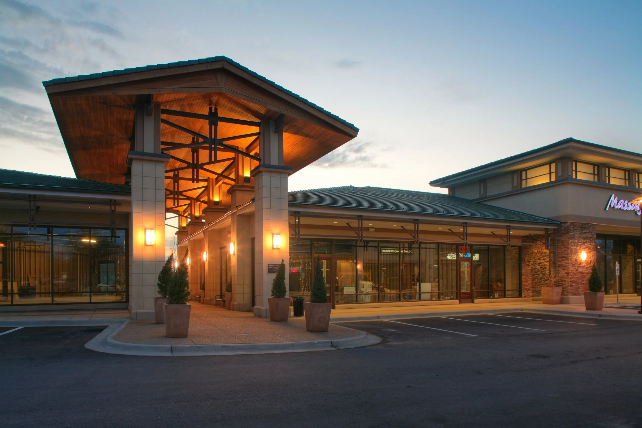 Prairie Trails West is a boutique shopping center in Olathe, KS featuring prairie-style architecture, glass entrances, and stone masonry.