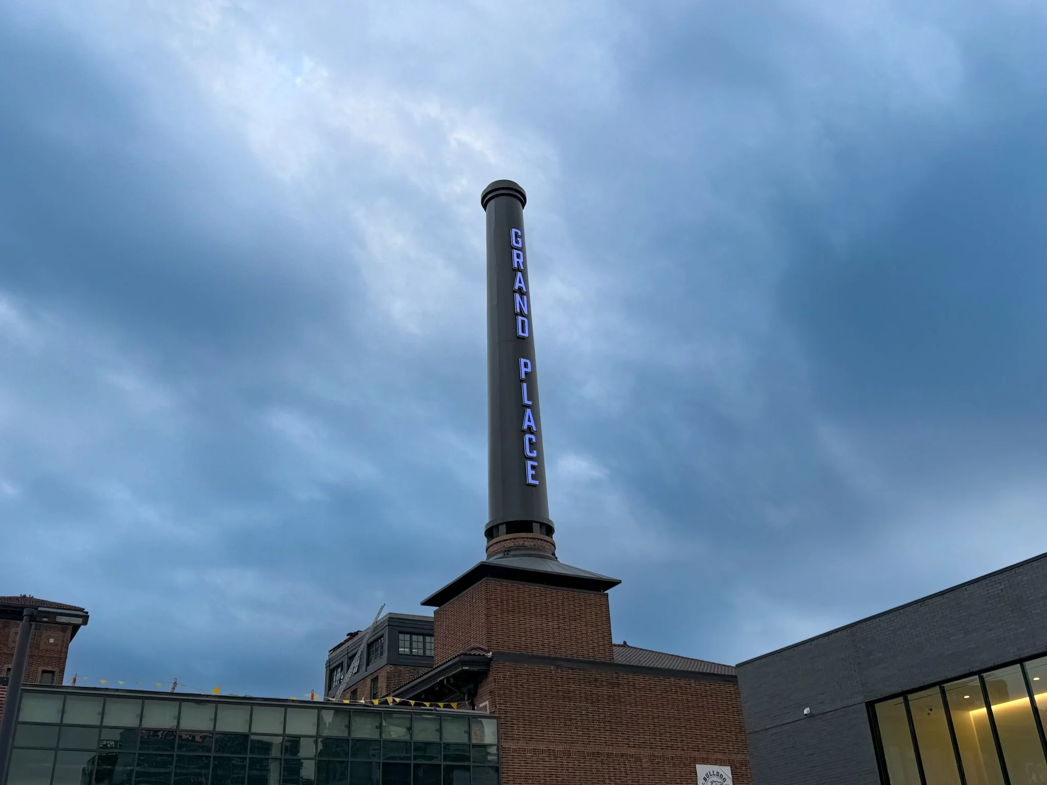 At the Grand Place KC project, the installation of the new marquee sign marked an especially exciting moment. The sign replicates the building’s original boiler chimney, honoring the historic character of the structure while signaling its transformation.