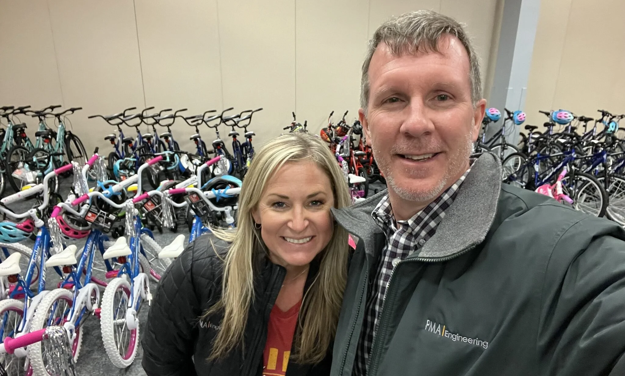 Jeff and Erin are in the Bike Room at the Red Bags KC center. Hundreds of bikes have been donated by so many wonderful people wanting to help others during this season. The bikes, along with presents, will be sent out to around 2,000 children and adults this Christmas through this completely volunteer charity.