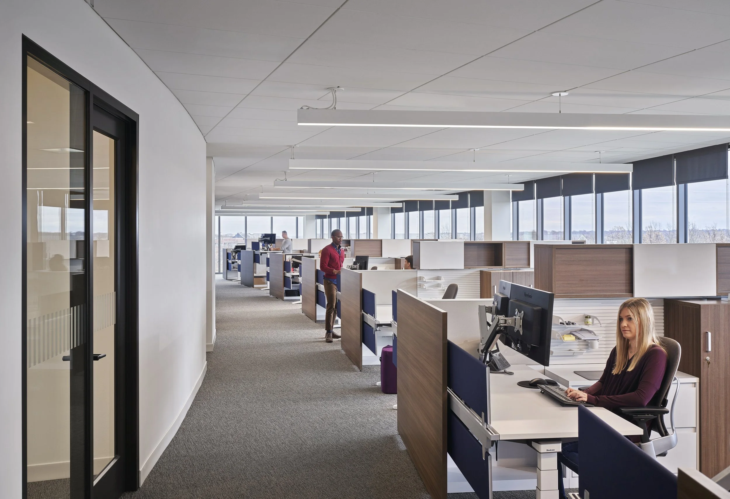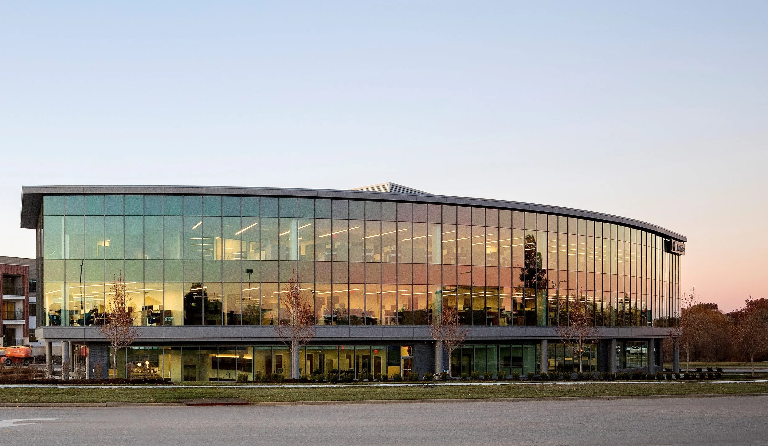 This three-story office building was designed as the headquarters for Tortoise Financial. The building’s exterior features a two-story, floor-to-ceiling glass with a contour following the curve of the street. Amenities include a fitness center, conferencing center, and exterior patio.